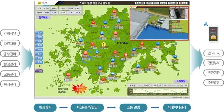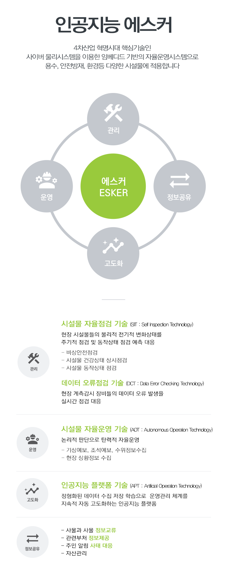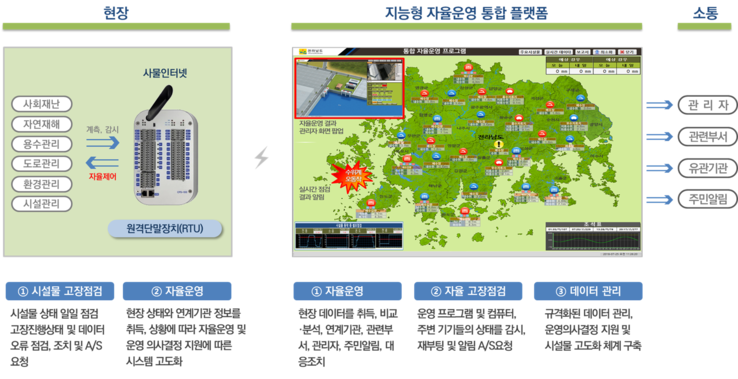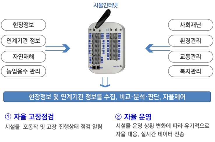 4차산업 혁명시대 핵심기술인 사이버 물리시스템 (CPS : Cyber Physical Systems)을 이용한 임베디드 기반의 자율운영시스템으로 용수, 안전방재, 환경등 다양한 시설물에 적용.